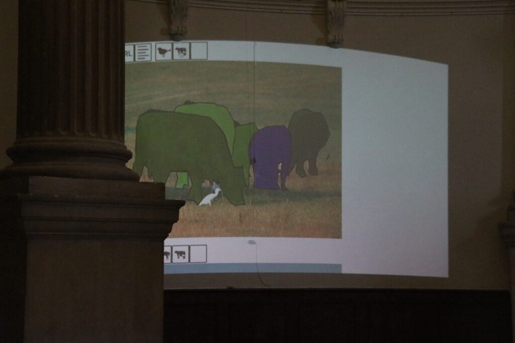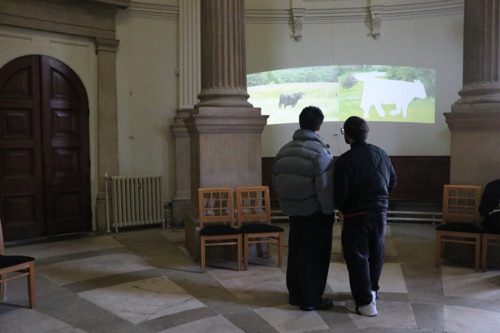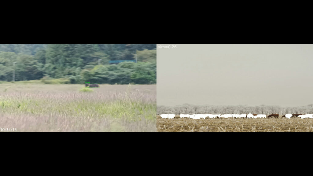 Common Objects in Context (COCO) is a large-scale image dataset widely used for computer vision tasks such as object detection, and it contains several thousand images labeled as “cow.” From this dataset, I developed an algorithm that selects images containing cows whose posture and appearance most closely resemble those of the cows captured in my video, and displays them alongside the footage. The video is accompanied by environmental sound data recorded at the same time as the filming.